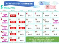 PICKUP 2022年4月22日 5月診療日・診療時間変更のお知らせ 5月から月曜が休診、火曜が不定期診療、5/14(土)と日曜が予防医療・継続治療のみの診療となります 5/14(土)と日曜日のご予約は電話でのみ承ります