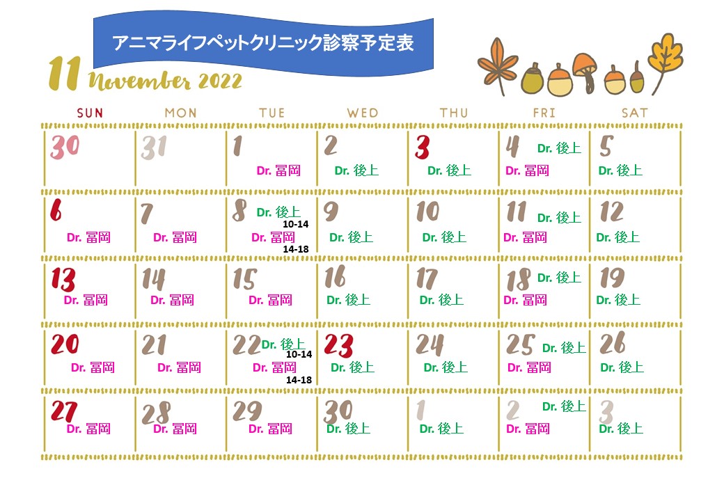 11月診察日・診察時間のお知らせ PICKUP, お知らせ, 診療日カレンダー 2022年10月29日 11月も休まず診察いたします。 診察時間は10時から18時まで。 火曜日の14時まで院長が診察に出る週があります。ぜひ、会いにいらしてください。 お待ちしております。